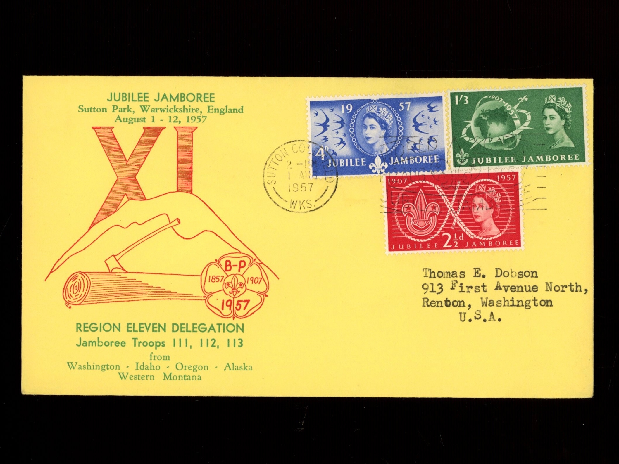 Region Eleven Delegation Jamboree Troops FDC with Sutton Coldfield slogan "World Scout Jubilee Jamboree". rare cover design. AT (see photo)